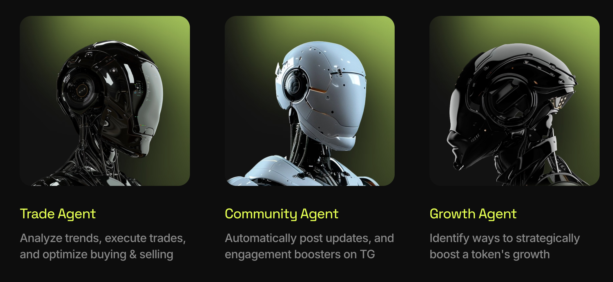 **4. Growth Agent Bot:** Analyzes market trends and investor behavior, suggesting strategies to maximize holder growth and improve long-term market stability.